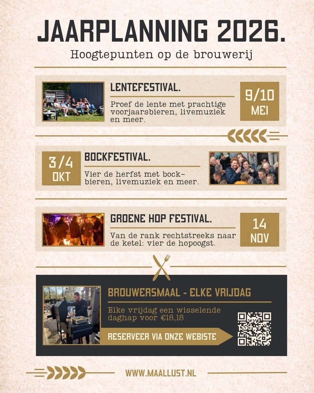 Met het proeflokaal, de historische setting en een levendige festivalagenda blijft Maallust een van de meest karaktervolle bierbestemmingen van Drenthe, waar techniek, omgeving en bierbeleving overtuigend samenkomen.