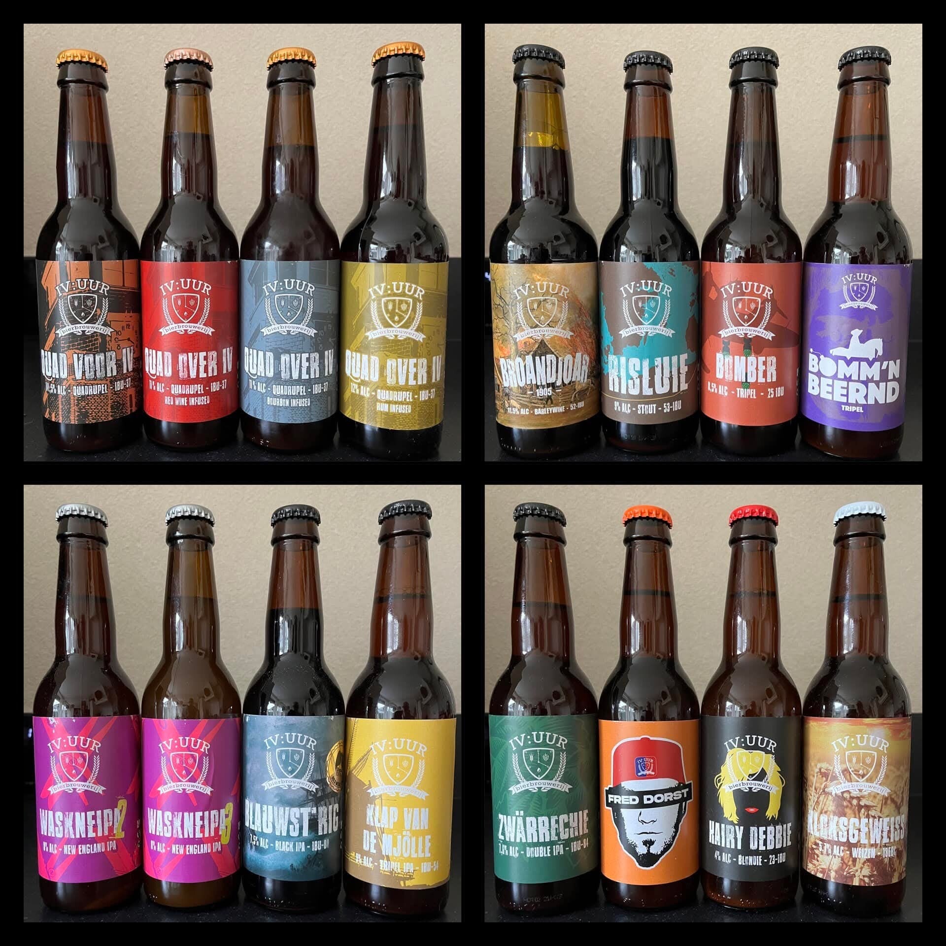 De bierlijn van IV:UUR beweegt zich vooral binnen de moderne crafthoek, met veel aandacht voor aroma, hopkarakter en drinkbeleving. New England IPA, Double IPA en andere hop-forward stijlen vormen het hart van het assortiment, terwijl daarnaast ook stevigere specials zoals imperial stout, barleywine, quadrupel en Black IPA verschijnen. Die combinatie geeft het merk een uitgesproken, eigentijdse signatuur binnen het speciaalbier uit Overijssel.