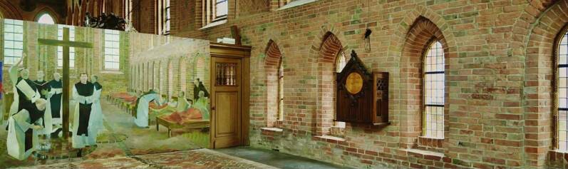 Je ziet hoe het begint in 1192, wanneer vanuit Klaarkamp een kleine groep cisterciënzer monniken en een abt aankomt op een verlaten wierde om daar een nieuwe abdij te stichten. Eerst is er vooral ruimte, hoogte, water en open land. Geen voltooide abdij, maar een plek waar wordt gekeken, gelopen, beoordeeld en begonnen. Vanuit die eerste soberheid groeit langzaam iets dat veel groter is dan een verzameling gebouwen. Tijdens de eerste grote bouw vullen bouwploegen, steenbakkers en timmerlui het terrein, terwijl de abdij steen voor steen vorm krijgt in het open landschap. Langzaam groeit daar een kloostercomplex waarin niet alleen ruimte is voor gebed en verblijf, maar ook voor opslag, ontvangst, werk en huishouding.